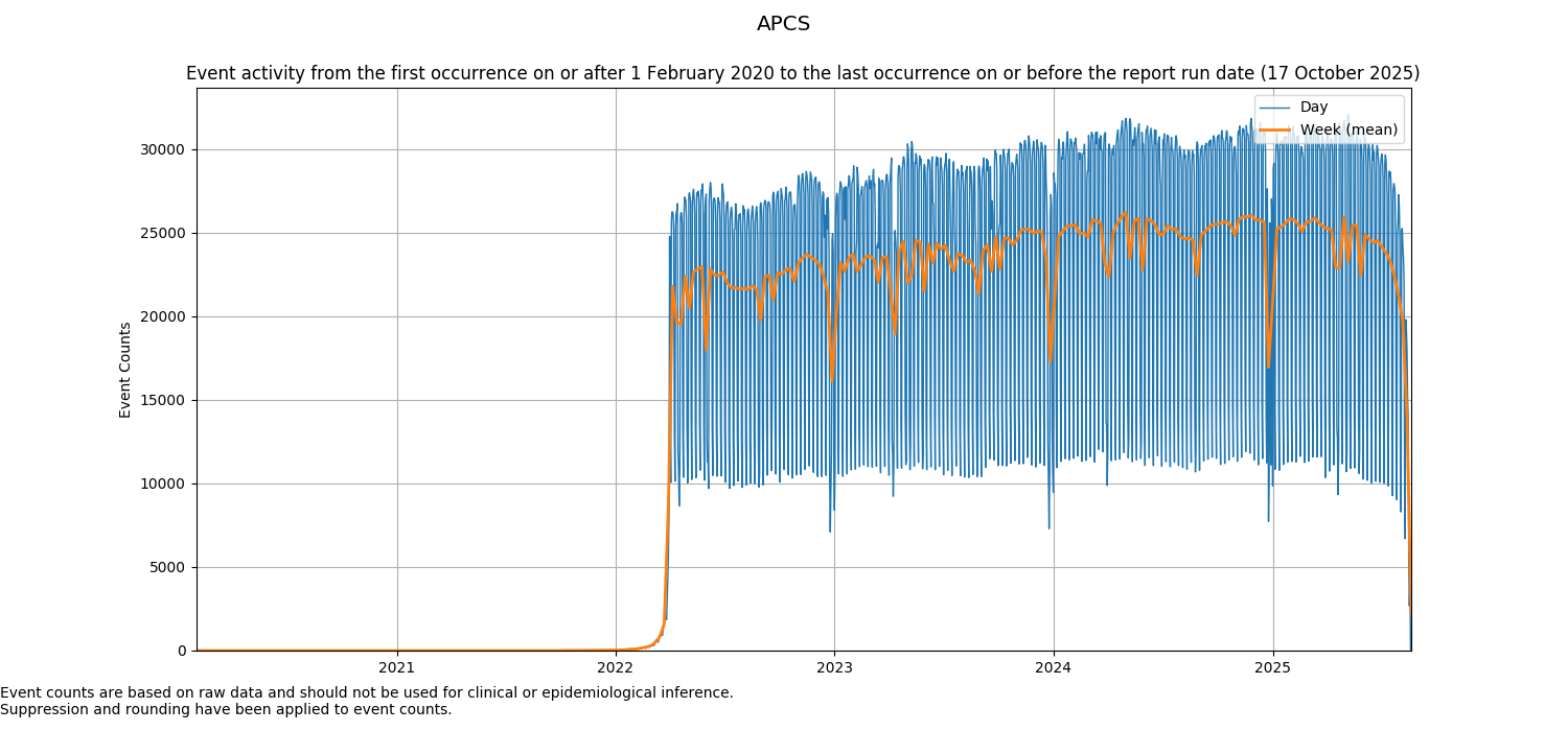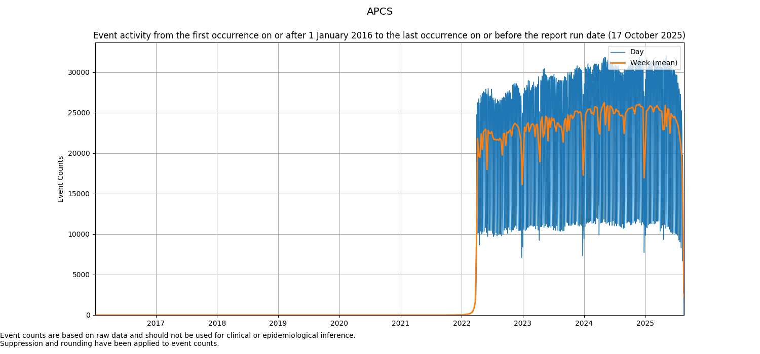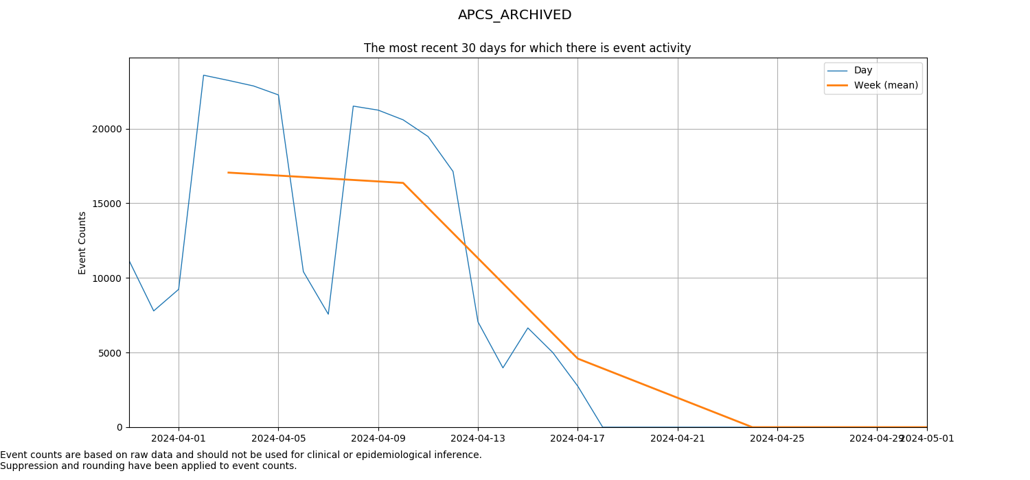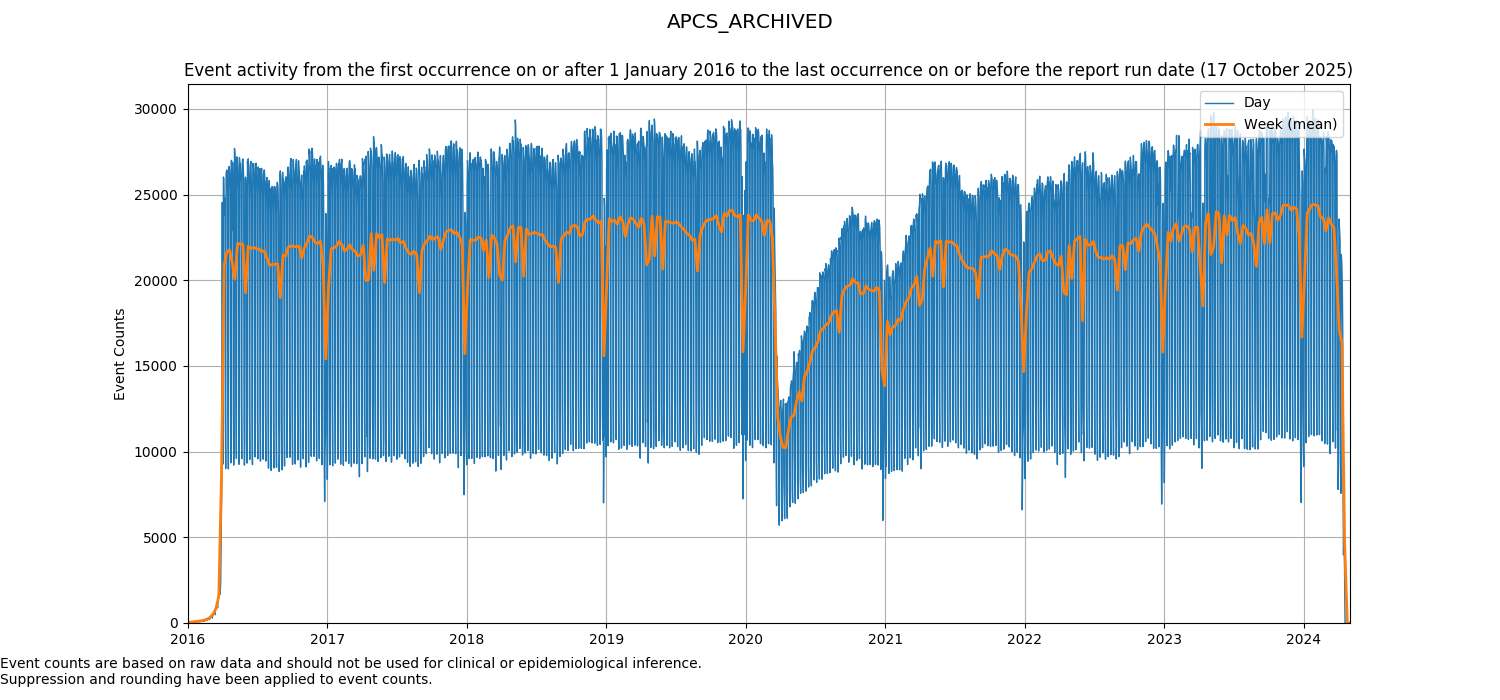 The APCS data comes from two underlying database tables. APCS contains data from March 2022 onwards while APCS_ARCHIVED contains data up to March 2024 - NB these tables overlap. This complexity is hidden from users via ehrQL which combines the two tables to provide a single view of the data. However for completeness the plots for both tables are shown below.