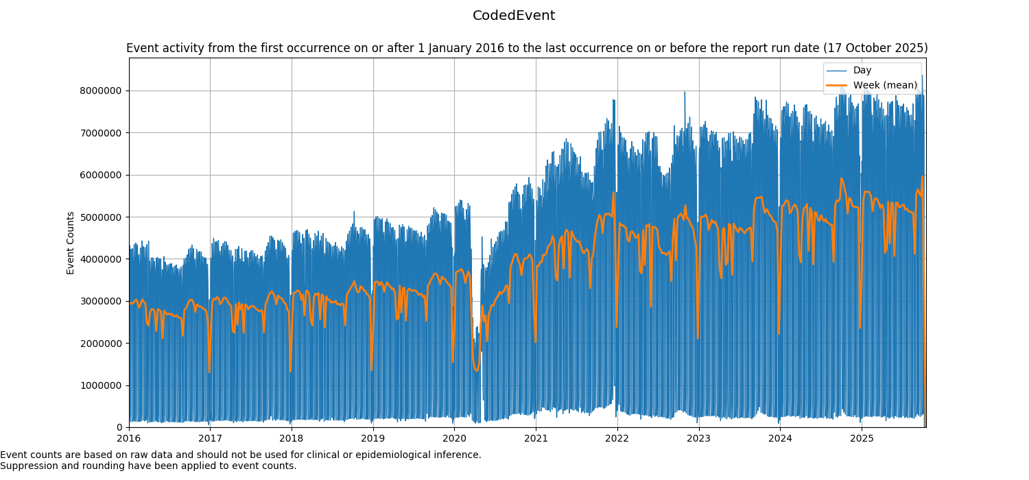 The OpenSAFELY-TPP database only includes patients who were registered at GP practices using TPP's SystmOne clinical information system (which is used by roughly 40% of GP practices) on or after 1 January 2009, including those patients who have since deregistered or died. The OpenSAFELY-TPP database therefore captures event activity for these patients only.