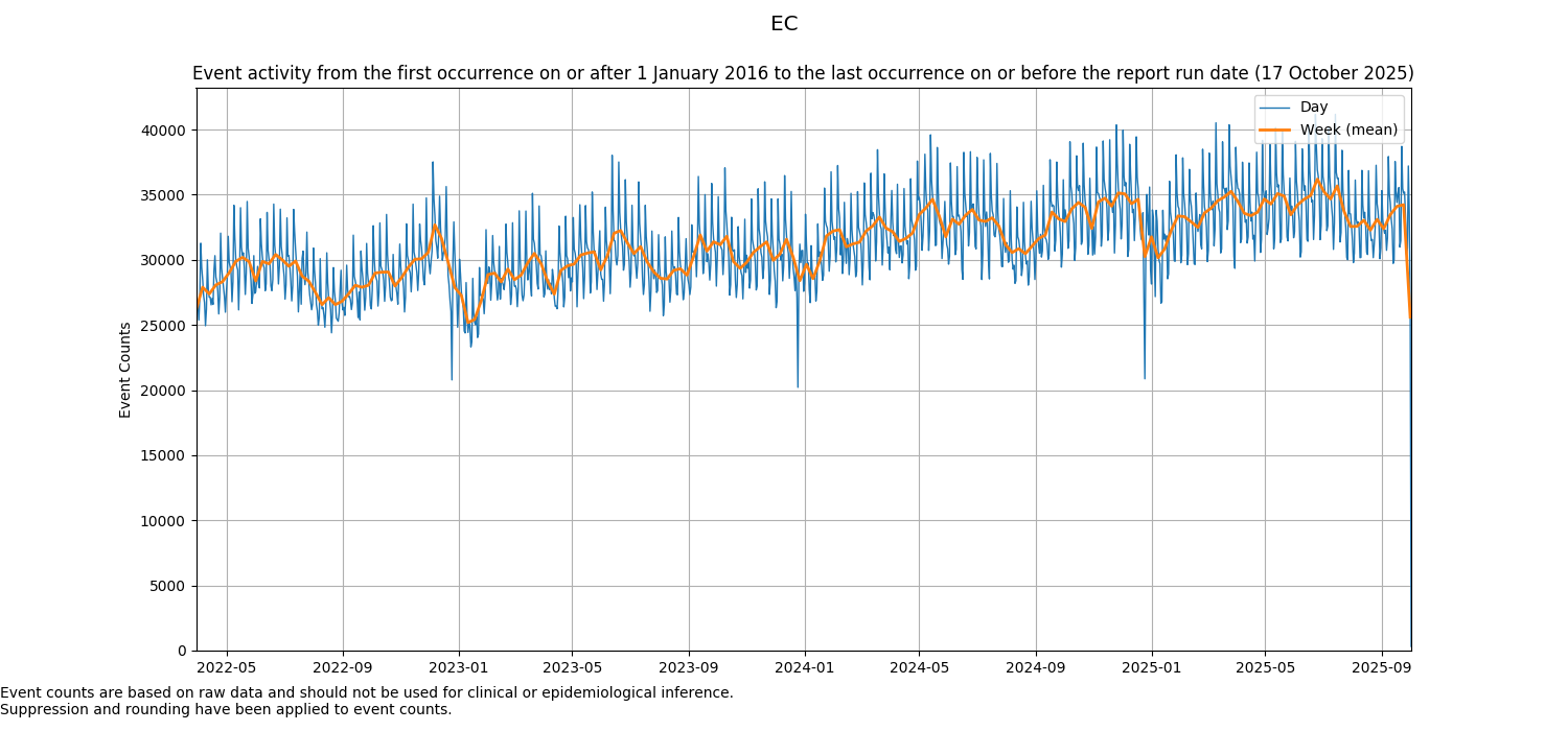 The EC data comes from two underlying database tables. EC contains data from March 2022 onwards while EC_ARCHIVED contains data up to March 2024 - NB these tables overlap. This complexity is hidden from users via ehrQL which combines the two tables to provide a single view of the data. However for completeness the plots for both tables are shown below.