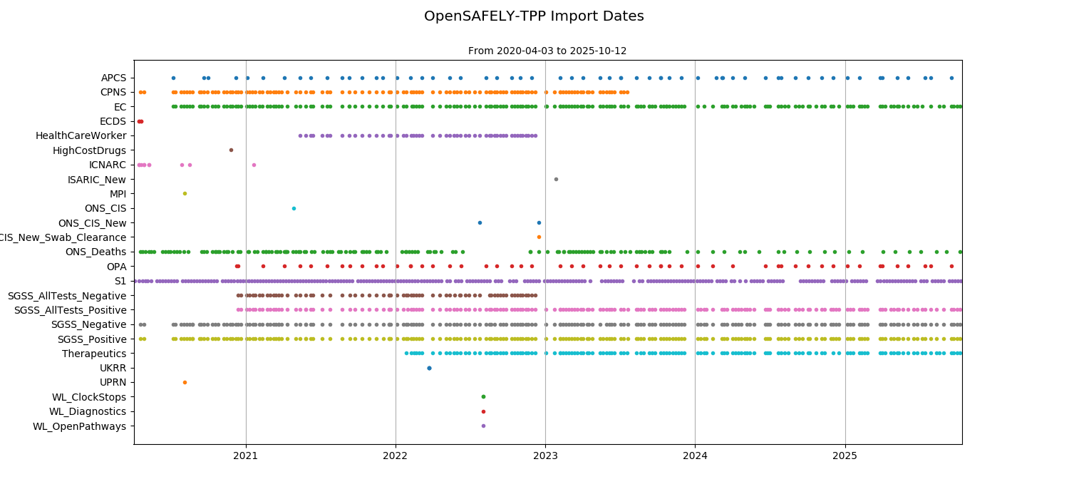 This report displays the import dates and coverage of the data sources in the OpenSAFELY-TPP database.